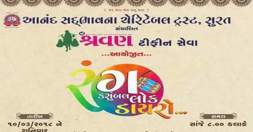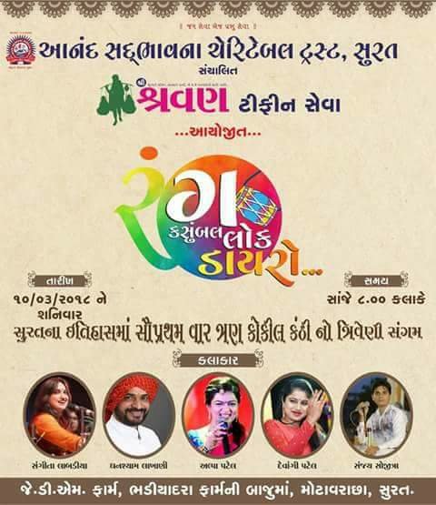 આનંદ સદભાવના ચેરીટેબલ ટ્રસ્ટ- સુરત દ્વારા સંચાલિત શ્રી શ્રવણ ટીફીન સેવા ના લાભાર્થે સુરત ના આંગણે ભવ્ય રંગ કસુંબલ લોક ડાયરો …