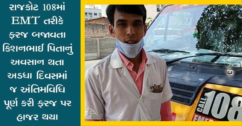 રાજકોટ 108માં EMT તરીકે ફરજ બજાવતા કિશનભાઈ પિતાનું અવસાન થતા અડધા દિવસમાં જ અંતિમવિધિ પૂર્ણ કરી ફરજ પર હાજર થયા