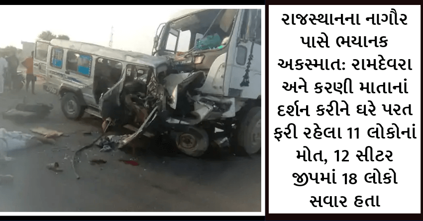 રાજસ્થાનના નાગૌર પાસે ભયાનક અકસ્માત: રામદેવરા અને કરણી માતાનાં દર્શન કરીને ઘરે પરત ફરી રહેલા 11 લોકોનાં મોત, 12 સીટર જીપમાં 18 લોકો સવાર હતા