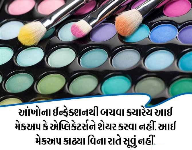 આંખોના ઈન્વેક્શનથી બચવા ક્યારેય આઈ મેકઅપ કે એપ્લિકેટર્સને શેયર કરવા નહીં આઈ મેકઅપ કાઢ્યા વિના રાતે સૂવું નહીં