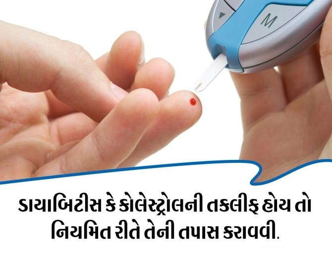 ડાયાબિટીસ કે કોલેસ્ટ્રોલની તકલીફ હોય તો નિયમિત રીતે તેની તપાસ કરાવવી.