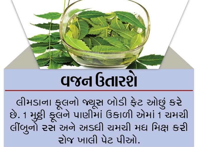 વજન ઉતારશે. લીમડાના ફૂલનો જ્યુસ બોડી ફેટ ઓછું કરે છે. 1 મુઠ્ઠી ફૂલને પાણીમાં ઉકાળી એમાં 1 ચમચી. લીંબુનો રસ અને અડધી ચમચી મધ મિક્ષ કરી રોજ ખાલી પેટ પીઓ.