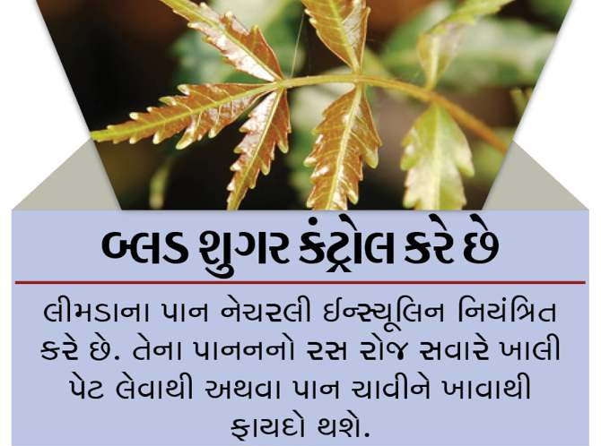 બ્લડ શુગર કંટ્રોલ કરે છે લીમડાના પાન નેચરલી ઈસ્યુલિન નિયંત્રિત કરે છે. તેના પાનનો રસ રોજ સવારે ખાલી પેટ લેવાથી અથવા પાન ચાવીને ખાવાથી