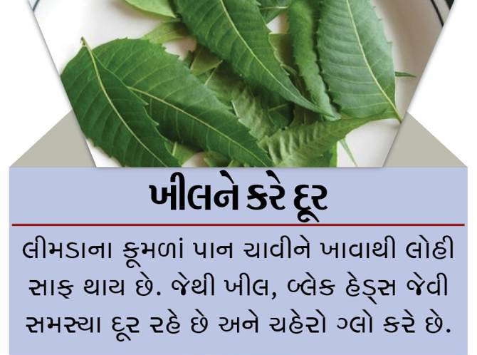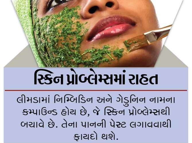 સ્કિન પ્રોબ્લેમ્સમાં રાહત લીમડામાં નિમ્બિડિન અને ગેનિન નામના કમ્પાઉન્ડ હોય છે, જે સ્કિન પ્રોબ્લેમ્સથી બચાવે છે. તેના પાનની પેસ્ટ લગાવવાથી