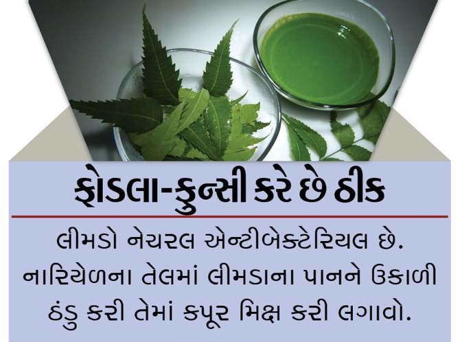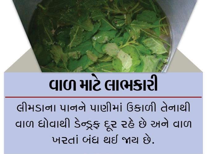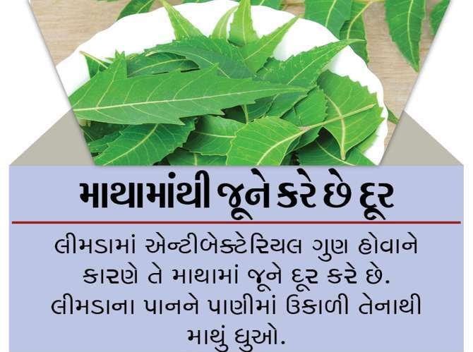 માથામાંથી જૂને કરેછે દૂર લીમડામાં એન્ટીબેક્ટરિયલ ગુણ હોવાને કારણે તે માથામાં જૂને દૂર કરે છે. લીમડાના પાનને પાણીમાં ઉકાળી તેનાથી માથું ધુઓ.