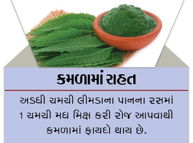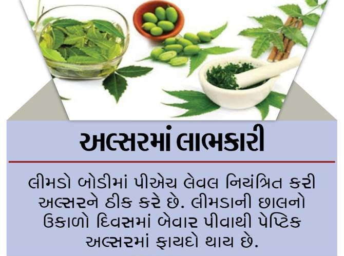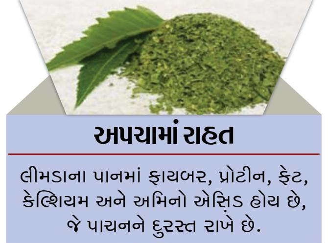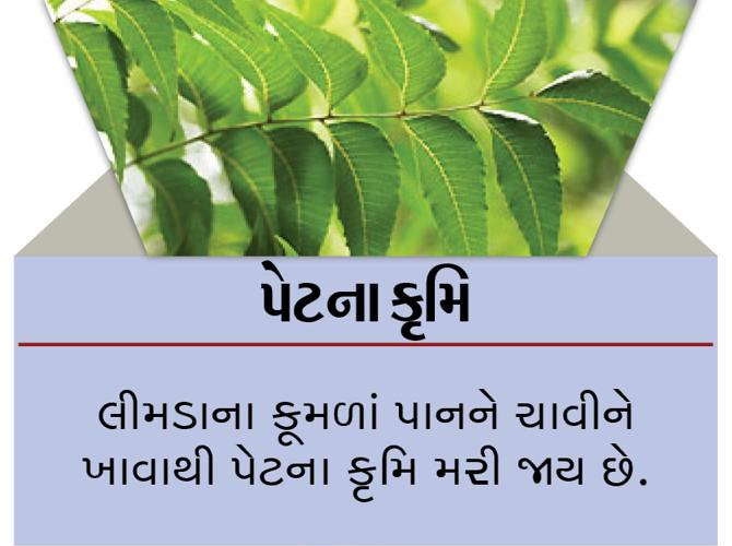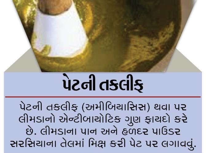 પેટની તકલીફ પેટની તકલીફ (અમીબિયાસિસ) થવા પર લીમડાનો એન્ટીબાયોટિક ગુણ ફાયદો કરે છે. લીમડાના પાન અને હળદર પાઉડર સરસિયાના તેલમાં મિક્ષ કરી પેટ પર લગાવવું.