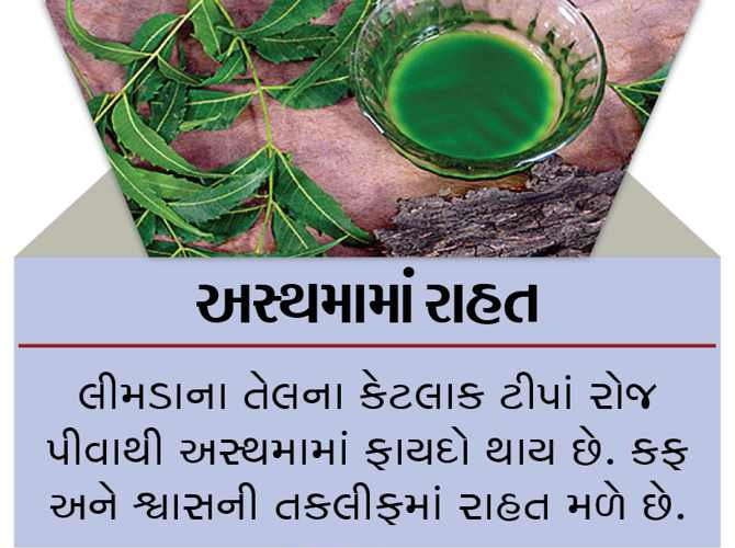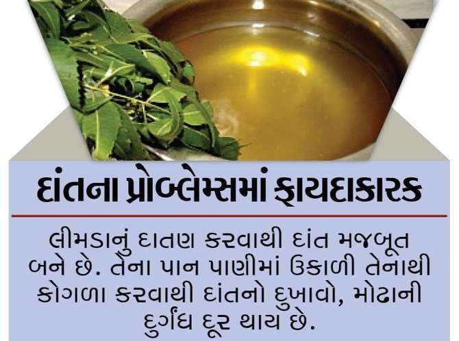 દાંતના પ્રોબ્લેમ્સમાં ફાયદાકારક લીમડાનું દાતણ કરવાથી દાંત મજબૂત . બને છે. તેના પાન પાણીમાં ઉકાળી તેનાથી કોગળા કરવાથી દાંતનો દુખાવો, મોઢાની દુર્ગધ દૂર થાય છે.