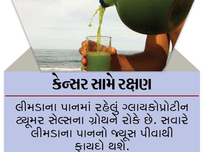 કેન્સર સામે રક્ષણ લીમડાના પાનમાં રહેલું ગ્લાયકોપ્રોટીના ટ્યૂમર સેલ્સના ગ્રોથને રોકે છે. સવારે લીમડાના પાનનો જ્યુસ પીવાથી ફાયદો થશે.