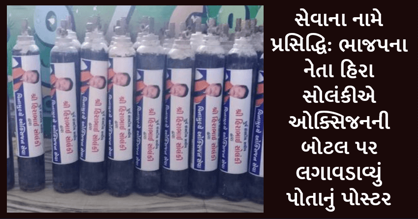 સેવાના નામે પ્રસિદ્ધિ: ભાજપના નેતા હિરા સોલંકીએ ઓક્સિજનની બોટલ પર લગાવડાવ્યું પોતાનું પોસ્ટર