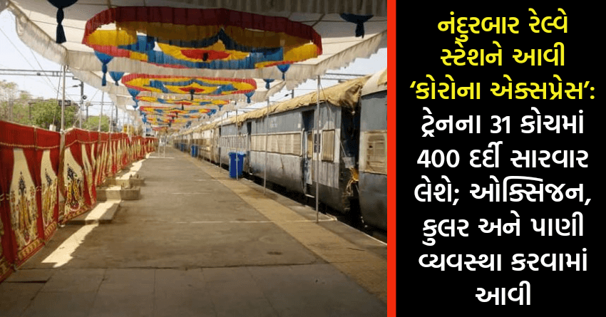 નંદુરબાર રેલવે સ્ટેશન ઉપર કોરોના એક્સપ્રેસ આવતા પ્લેટફોર્મ નં 3 પ્રતિબંધિત ક્ષેત્ર ઘોષિત કરાયો છે. બીજી તરફ દર્દીને યોગ્ય સુવિધા મળી રહે તે માટે પ્લેટફોર્મ પર મંડપ બનાવાયો છે. સાથે સાથે કોચમાં કુલરની સાથે ઉનાળાે હોવાથી કોચની છત પર કંતાન બાંધવામાં આવ્યા છે.
