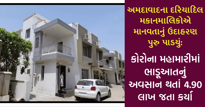 કોરોનાની માઠી અસર ધંધા-રોજગાર પર પણ પડી છે ત્યારે આવક ના હોવા છતાં દર મહિને ભાડું આપવું લોકો માટે મુશ્કેલ બન્યું છે. અમદાવાદના કેટલાક પ્રોપર્ટી ઓનર્સે કોરોનામાં પરિવારના મોભીના અવસાનને કારણે, બિઝનેસમાં આવક ના હોવાને કારણે લાખો રૂપિયાનું ભાડું જતું કરી માનવતાનું શ્રેષ્ઠ ઉદાહરણ પૂરું પાળ્યું છે. મહામારીના મુશ્કેલ સમયમાં કોઇના ખભા પર રાખેલો હાથ સફળતા પર મળેલી તાળીઓ કરતાં વધુ મૂલ્યવાન હોય છે.