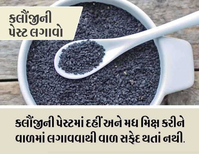 કલોંજીની પેસ્ટમાં દહીં અને મધ મિક્ષ કરીને વાળમાં લગાવવાથી વાળ સફેદ થતાં નથી.