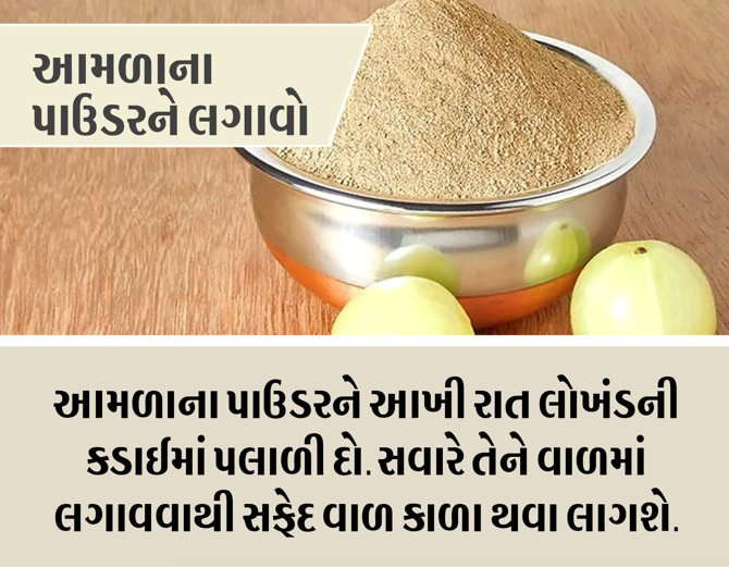 આમળાના પાઉડરને લગાવો – આમળાના પાઉડરને આખી રાત લોખંડની કડાઈમાં પલાળી દો. સવારે તેને વાળમાં લગાવવાથી સફેદ વાળ કાળા થવા લાગશે.