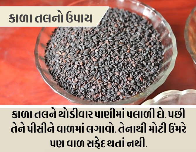 કાળા તલનો ઉપાય – કાળાતલને થોડીવાર પાણીમાં પલાળી દો. પછી તેને પીસીને વાળમાં લગાવો. તેનાથી મોટી ઉંમરે પણ વાળ સફેદ થતાં નથી.