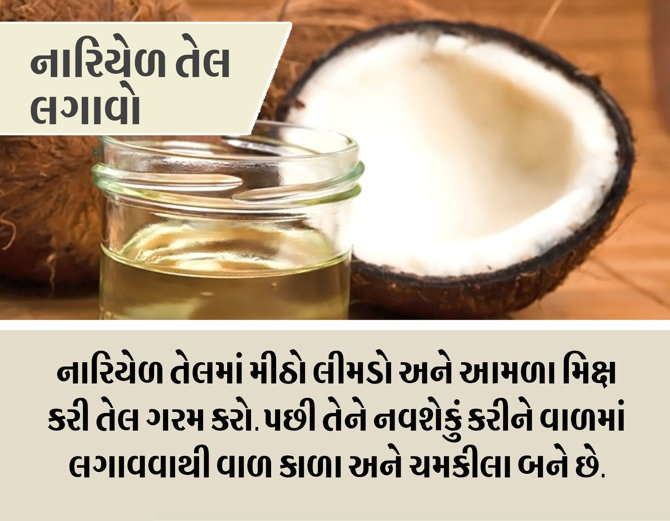 નારિયેળ તેલમાં મીઠો લીમડો અને આમળા મિક્ષ કરી તેલ ગરમ કરો. પછી તેને નવશેકું કરીને વાળમાં લગાવવાથી વાળ કાળા અને ચમકીલા બને છે.