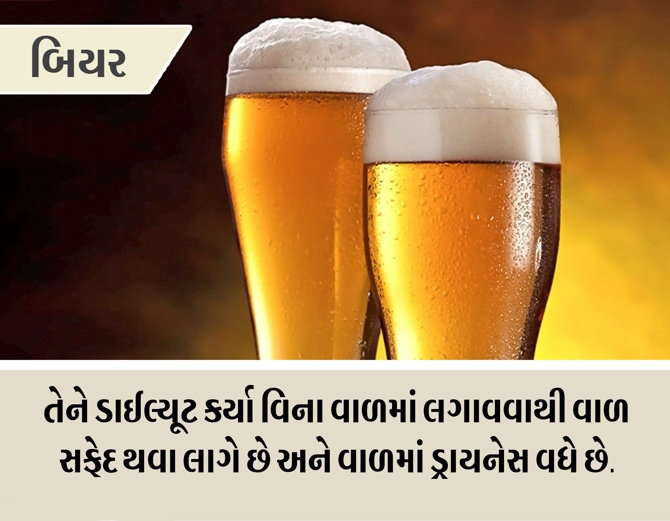 બિયર- તેને ડાઈશૂટ કર્યા વિના વાળમાં લગાવવાથી વાળ સફેદ થવા લાગે છે અને વાળમાં ડ્રાયનેસ વધે છે.