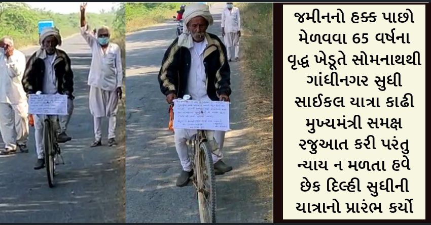 જમીનનો હક્ક પાછો મેળવવા 65 વર્ષના વૃદ્ધ ખેડૂતે સોમનાથથી ગાંધીનગર સુધી સાઈકલ યાત્રા કાઢી મુખ્યમંત્રી સમક્ષ રજુઆત કરી પરંતુ ન્યાય ન મળતા હવે છેક દિલ્હી સુધીની યાત્રાનો પ્રારંભ કર્યો