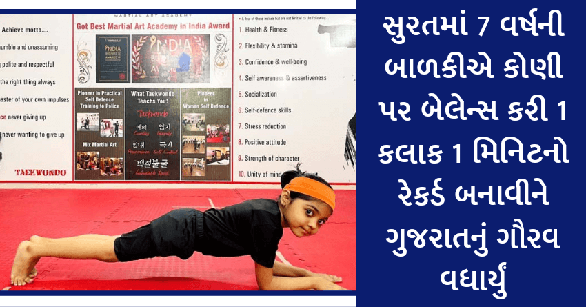 સુરતની એક 7 વર્ષની માસૂમ બાળકીએ કોણી પર બેલેન્સ રાખીને 1 કલાક 1 મિનિટનો રેકર્ડ પોતાના નામે અંકિત કરી દીધો છે. તેની આ સિધ્ધી ઇન્ડિયા બૂક ઓફ રેકર્ડસમાં નોંધાઇ છે. આ નાનકડી બાળકીના ટેલન્ટે સુરતની સાથે રાજ્યનું ગૌરવ વધાર્યું છે. પોતાની દિકરીમાં આવું અદભૂત ટેલન્ટ છે એ વાતની માતા-પિતાને ખબર જ નહોતી, ટાયકોન્ડોના કલાસ ટીચરે જયારે માહિતી આપી ત્યારે ખબર પડી. હવે આ બાળકીના પિતા 4 કલાક અને 19 મિનિટનો વર્લ્ડ રેર્કડ તોડવા માટે દિકરી પાસે મહેનત કરાવી રહ્યા છે. આ ટેલેન્ટને Plank Pose કહેવામાં આવે છે.