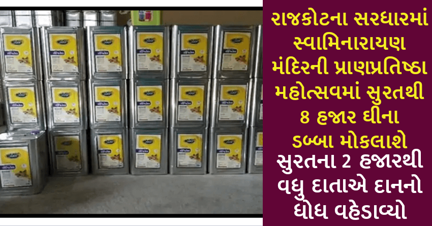 રાજકોટના સરધારમાં સ્વામિનારાયણ મંદિરની પ્રાણપ્રતિષ્ઠા મહોત્સવમાં સુરતથી 8 હજાર ઘીના ડબ્બા મોકલાશે, સુરતના 2 હજારથી વધુ દાતાએ દાનનો ધોધ વહેડાવ્યો