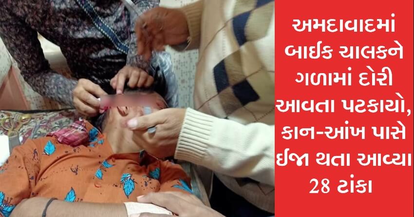 અમદાવાદમાં બાઈક ચાલકને ગળામાં દોરી આવતા પટકાયો, કાન-આંખ પાસે ઈજા થતા આવ્યા 28 ટાંકા