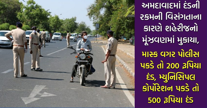 અમદાવાદમાં દંડની રકમની વિસંગતાના કારણે શહેરીજનો મૂંઝવણમાં મુકાયા, માસ્ક વગર પોલીસ પકડે તો 200 રૂપિયા દંડ, મ્યુનિસિપલ કોર્પોરેશન પકડે તો 500 રૂપિયા દંડ