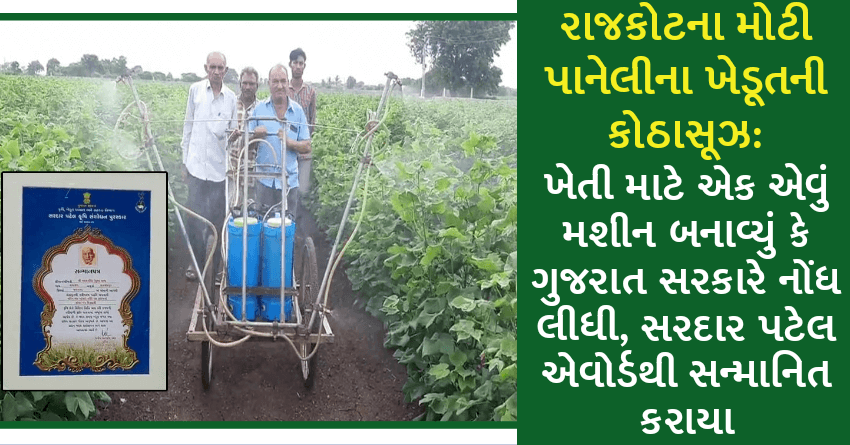ઉપલેટાના મોટી પાનેલીના ખેડૂતની કોઠાસૂઝથી ખેતરમાં દવા છાંટવાની લારી બનાવી છે ત્યારે આ દવા છંટકાવ કરવાના મશીન બનાવવાને લીધે તેમને સરદાર પટેલ એવોર્ડથી સન્માનિત પણ કરવામાં આવ્યા છે.