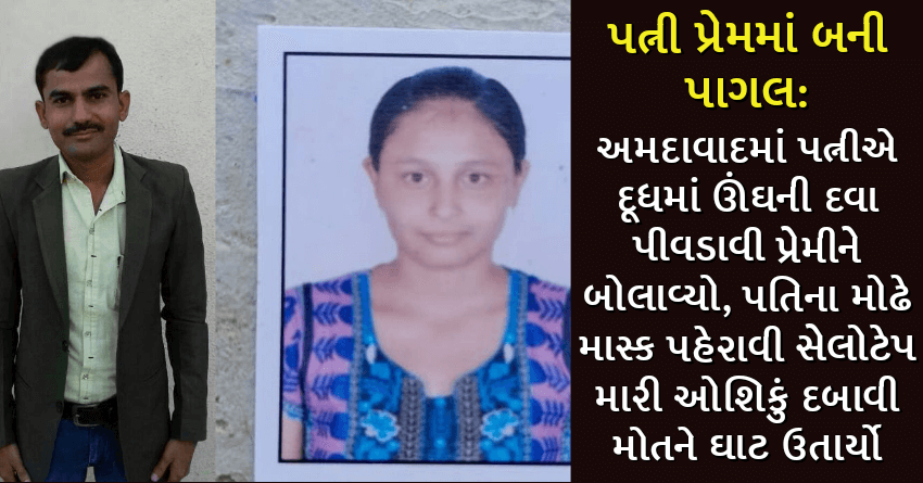 પત્ની પ્રેમમાં બની પાગલ: અમદાવાદમાં પત્નીએ દૂધમાં ઊંઘની દવા પીવડાવી પ્રેમીને બોલાવ્યો, પતિના મોઢે માસ્ક પહેરાવી સેલોટેપ મારી ઓશિકું દબાવી મોતને ઘાટ ઉતાર્યો