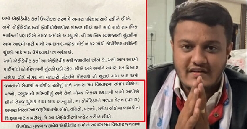 અમદાવાદમાં AAP ઉમેદવાર ડો. વિશાલ પટેલે એફિડેવિટ કરી- મારો પાંચ વર્ષનો પગાર વિકાસમાં વાપરીશ તેવી જાહેરાત કરી