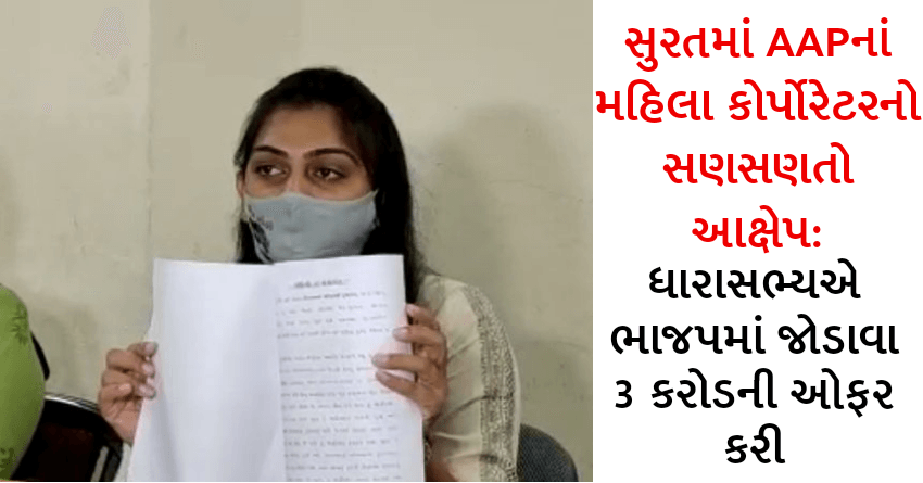 સુરતમાં AAPનાં મહિલા કોર્પોરેટરનો સણસણતો આક્ષેપ: ધારાસભ્યએ ભાજપમાં જોડાવા 3 કરોડની ઓફર કરી, પતિને 25 લાખ લઈ ભાજપમાં ભેળવી દેવાયા બાદ ભાજપ દ્વારા દબાણ કરાયું