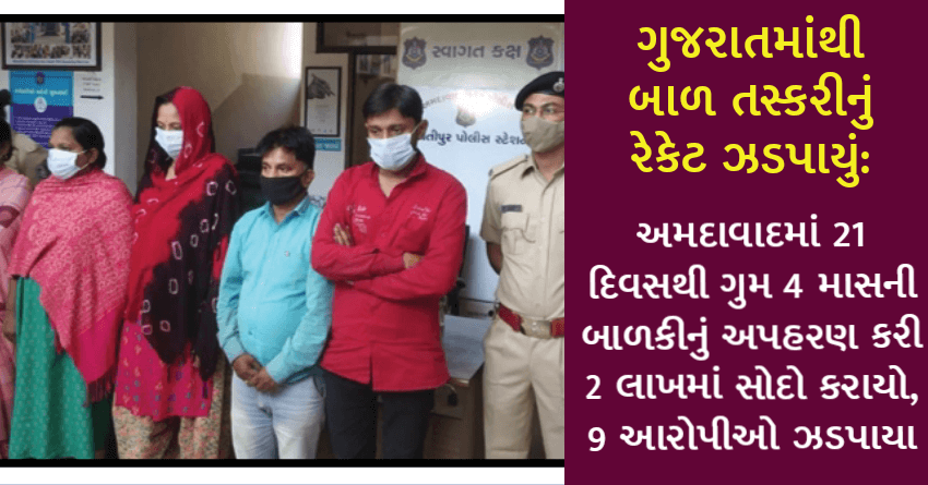 ગુજરાતમાંથી બાળ તસ્કરીનું રેકેટ ઝડપાયું: અમદાવાદમાં 21 દિવસથી ગુમ 4 માસની બાળકીનું અપહરણ કરી 2 લાખમાં સોદો કરાયો, 9 આરોપીઓ ઝડપાયા