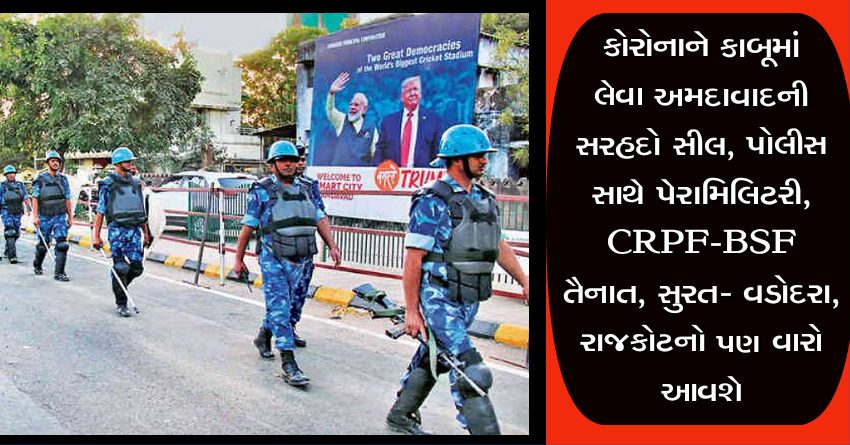 અમદાવાદ શહેર કોરોનાનું હોટસ્પોટ બની ગયા બાદ પણ કોરોના પોઝિટિવના વધતા જતા કેસોને કાબૂમાં લેવા અને લોકડાઉન નો કડક અમલ કરાવવા માટે અમદાવાદ શહેરની સરહદો સીલ કરીને શહેરમાં પોલીસની સાથે પેરામિલિટરી, BSF અને CRPF તૈનાત કરવામાં આવશે. આ જ પ્રમાણે હોટસ્પોટ વડોદરા શહેર, સુરત અને રાજકોટમાં પણ સરહદો સીલ કરી કડક અમલ કરવામાં આવશે.