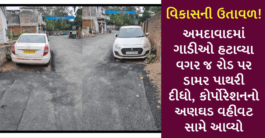 વિકાસની ઉતાવળ! અમદાવાદમાં ગાડીઓ હટાવ્યા વગર જ રોડ પર ડામર પાથરી દીધો, કોર્પોરેશનનો અણઘડ વહીવટ સામે આવ્યો
