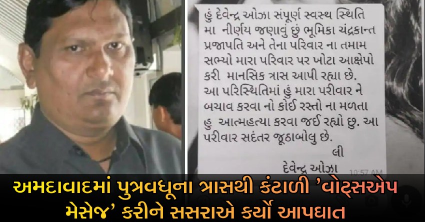 અમદાવાદમાં પુત્રવધૂના ત્રાસથી કંટાળી ‘વોટ્સએપ મેસેજ’ કરીને સસરાએ કર્યો આપઘાત