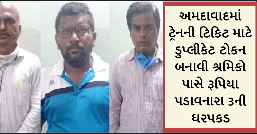 અમદાવાદમાં ટ્રેનની ટિકિટ માટે ડુપ્લીકેટ ટોકન બનાવી શ્રમિકો પાસે રૂપિયા પડાવનારા 3ની ધરપકડ