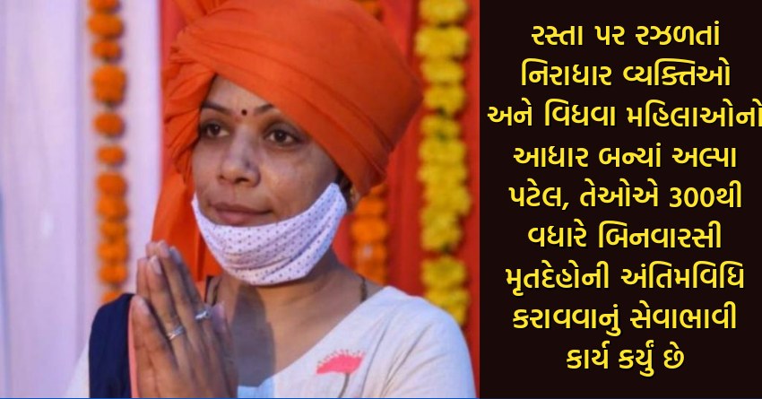 રસ્તા પર રઝળતાં નિરાધાર વ્યક્તિઓ અને વિધવા મહિલાઓનો આધાર બન્યાં અલ્પા પટેલ, તેઓએ 300થી વધારે બિનવારસી મૃતદેહોની અંતિમવિધિ કરાવવાનું સેવાભાવી કાર્ય કર્યું છે