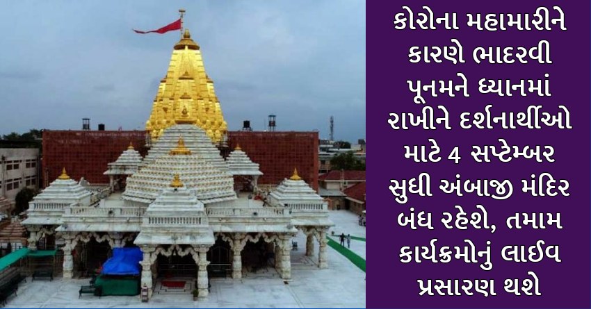 કોરોના મહામારીને કારણે ભાદરવી પૂનમને ધ્યાનમાં રાખીને દર્શનાર્થીઓ માટે 4 સપ્ટેમ્બર સુધી અંબાજી મંદિર બંધ રહેશે, તમામ કાર્યક્રમોનું લાઈવ પ્રસારણ થશે