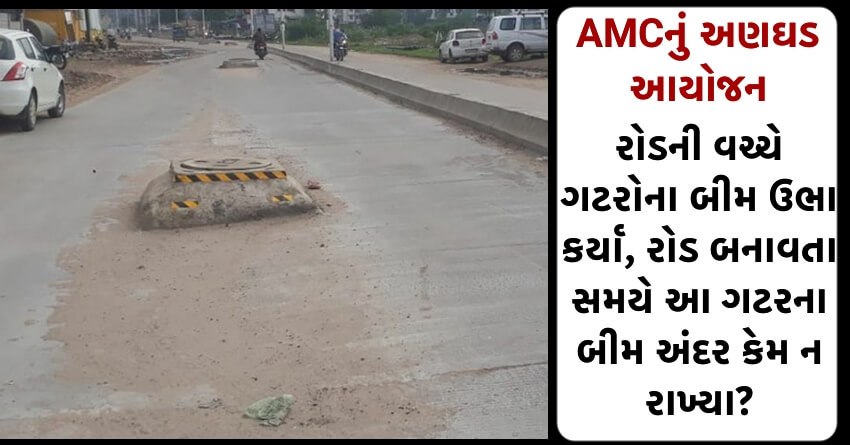 અમદાવાદ મ્યુનિસિપલ કોર્પોરેશનું અણઘડ આયોજન, રોડની વચ્ચે ગટરોના બીમ ઉભા કર્યા, રોડ બનાવતા સમયે આ ગટરના બીમ અંદર કેમ ન રાખ્યા? વાહન ચાલકોમાં અકસ્માતનો ભય