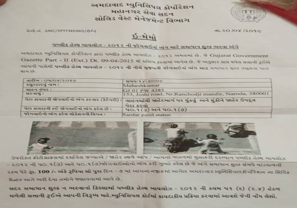 નારાણપુરામાં આવેલા સરદાર પટેલના સ્ટેચ્યુ પાસે જાહેરમાં થુકવા બદલ નરોડા વિસ્તારમાં રહેતા મહેશ કુમાર નામના વ્યક્તિને અમદાવાદ મ્યુ. કોર્પોરેશને રૂ 100નો દંડ ફટકાર્યો છે. AMCએ જાહેરમાં થુકવા બદલ કોઈને ઈ-મેમોથી દંડ ફટકાર્યો હોય તેવો આ પ્રથમ કિસ્સો છે.