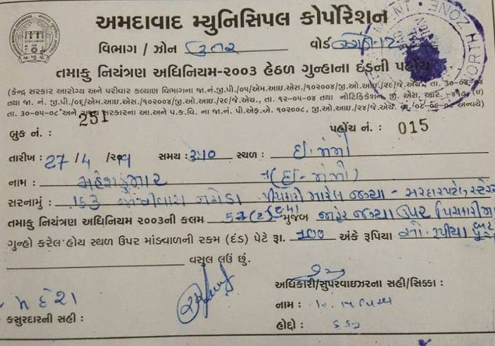 અમદાવાદ શહેરના ઉત્તર ઝોનમાં નરોડામાં રહેતો એક યુવાને પાન-મસાલો ખાઈ જાહેર રોડ પર પિચકારી મારી હતી. આ દ્રશ્યો ચાર રસ્તા પરનાં સીસીટીવી કેમેરામાં કેદ થઈ ગયા હતા. જે બાદ અમદાવાદ કોર્પોરેશન દ્વારા વાહનમાંથી જાહેરમાર્ગ પર થૂંકવું અને થૂંકીને ઉપદ્વવ પેદા કરવા માટે તમાકુ નિયંત્રણ અધિનિયમ 2003ની કલમ 50.1(3) અને 50.1(7) હેઠળ ગુનો નોંધી 100 રૂપિયાનો દંડ કરવામાં આવ્યો હતો. અમદાવાદમાં પાન-મસાલાની પિચકારી મારવા બદલ નરોડાના યુવાનને પ્રથમ ઈ-મેમો આપવામાં આવ્યો હતો. જે બાદ યુવાને નજીકના અમદાવાદ કોર્પોરેશનના સિવિક સિવિક સેન્ટરમાં દંડની રકમ ભરી હતી.
