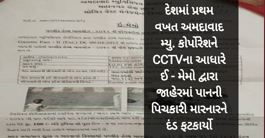 5 હજાર CCTV જાહેરમાં થુકનાર પર વોચ કરી રહ્યા છેઃ અમદાવાદ સ્માર્ટ સિટી પ્રોજેક્ટ અંતર્ગત લગાવાયેલા 5000 CCTV કેમેરા અમદાવાદીઓ પર નીગરાની કરી રહ્યા છે. AMCના અધિકારીઓને 15 દિવસ પહેલાં જ ટ્રેનિંગ અપાઈ છે કે જાહેરમાં પાન-મસાલા ખાઈ પિચકારી કરનાર લોકોને ઈ-મેમોથી દંડ કરવાના છે. જેના સંદર્ભે AMCએ 20 એપ્રિલે ઈ-મેમો દ્વારા આ દંડ ફટકાર્યો હતો. ઈ-મેમોથી દંડ ફટકાનાર અમદાવાદ મ્યુ. કોર્પોરેશનએ દેશની પ્રથમ કોર્પોરેશન છે.