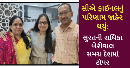 ચાર્ટડ એકાઉન્ટન્ટ્સ માટે લેવામાં આવેલી ફાઈનલ પરીક્ષાનું પરિણામ જાહેર કરી દેવામાં આવ્યું છે. જેમાં ન્યૂ કોર્સમાં પ્રથમ ક્રમે સુરત સેન્ટરની રાધિકા બેરીવાલા નામની વિદ્યાર્થિની આવી છે. જ્યારે બીજા નંબર પર ખતૌલીના નીતિન જૈન રહ્યાં છે. જ્યારે ત્રીજા ક્રમે ચેન્નઈની નિવેદિતા આવી છે.
