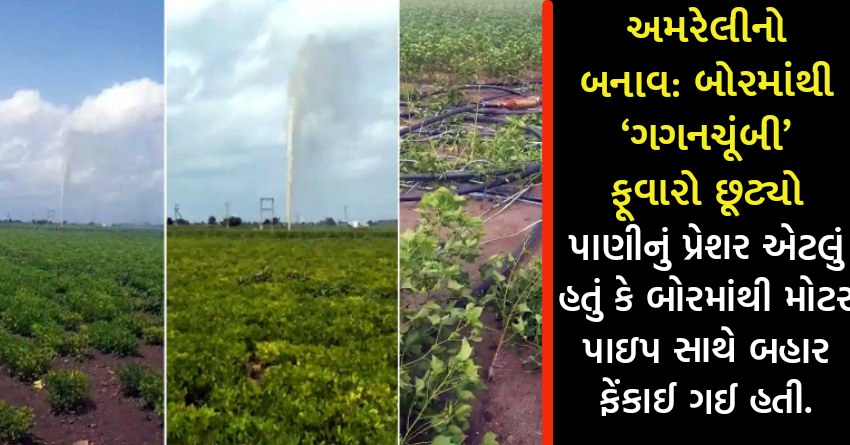 અમરેલીનો બનાવ: બોરમાંથી ‘ગગનચૂંબી’ ફૂવારો છૂટ્યો, પાણીનું પ્રેશર એટલું હતું કે બોરમાંથી મોટર પાઇપ સાથે બહાર ફેંકાઈ ગઈ હતી.