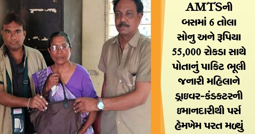 AMTSની બસમાં 6 તોલા સોનુ અને રૂપિયા 55,000 રોકડા સાથે પોતાનું પાકિટ ભૂલી જનારી મહિલાને ડ્રાઇવર-કંડકટરની ઇમાનદારીથી પર્સ હેમખેમ પરત મળ્યું