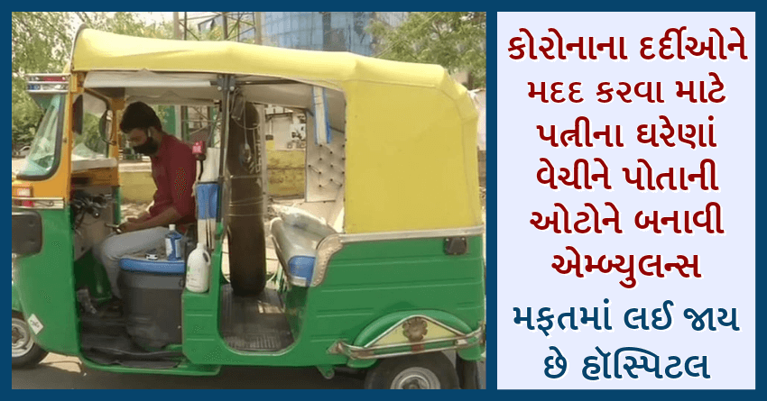 કોરોનાના દર્દીઓને મદદ કરવા માટે લોકો પોત-પોતાની રીતે પ્રયત્નો કરી રહ્યા છે. કોઈક બાઇક એમ્બ્યુલન્સ બનાવીને લોકોને મફતમાં હૉસ્પિટલ પહોંચાડે છે તો કોઈક પૈસાઓ આપીને, તો કોઈક ઓક્સિજન સિલિન્ડર આપીને મદદ કરી રહ્યા છે. આવું જ માનવતાનું વધુ એક ઉદાહરણ સામે આવ્યું છે. જેમાં એક શખ્સે પોતાની પત્નીના ઘરેણાં વેચીને પોતાની ઓટો રિક્ષાને એમ્બ્યુલન્સ બનાવીને લોકોની સેવા કરી રહ્યો છે. કોરોનાની બીજી લહેરે મધ્ય પ્રદેશ, ગુજરાત, દિલ્હી, મહારાષ્ટ્ર, કર્ણાટક, કેરળ સહિત ઘણા રાજ્યોમાં હાહાકાર મચાવી રાખ્યો છે. આવા કપરા સમયમાં લોકોના અનેક ચહેરા જોવા મળી રહ્યા છે.