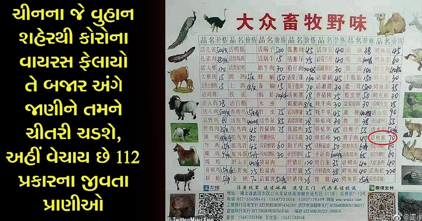 વુહાન શહેર જ્યાંથી કોરોનાવાયરસ ફેલાયો ત્યાં જાનવરોનું બજાર છે. અહીં મરઘા, માછલી કે બકારનું માંસ જ મળતું નથી પરંતુ તમામ પ્રકારના જાનવરોના માંસ મળે છે જેને વ્યક્તિ ખાઇ શકે છે અથવા તો તેને ખાવાની ઇચ્છા ધરાવે છે. વુહાનના પ્રાણી બજારમાં અંદાજે 112 પ્રકારના જીવતા જીવજંતુઓ અને માંસ અને તેમના અંગો વેચાય છે. આ સિવાય મરેલા પ્રાણીઓ પણ અલગથી વેચાય છે. ફોટોમાં દેખાય છે કે જીવજંતુઓના ફોટાવાળા રેટ કાર્ડ.