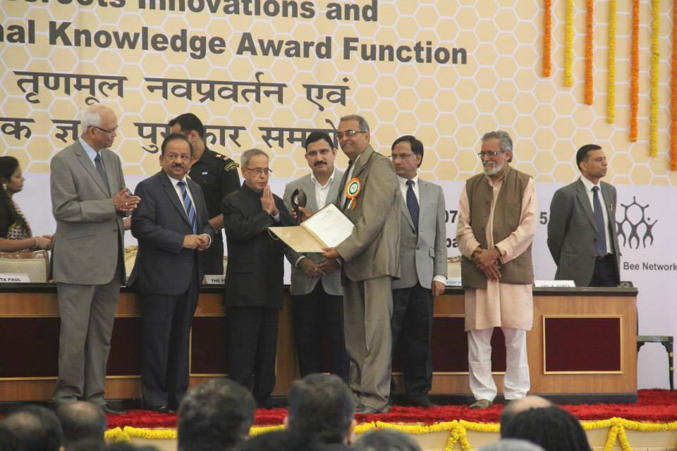 દિલ્હી રાષ્ટ્રપતિ ભવન ખાતે નેશનલ ઇનોવેશન ફાઉન્ડેશન દ્વારા યોજાયેલ એકઝીબીશનમાં બ્રિક અેન્ડ બ્લોક મશિન પ્રદર્શન કરવામાં આવતાં રાષ્ટ્રપતિ પ્રણવ મુખરજી દ્વારા રાષ્ટ્ર લેવલે બીજા નંબરનો એવોર્ડ એનાયત કરવામાં આવ્યો હતો.