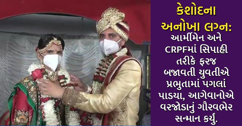કેશોદના અનોખા લગ્ન: આર્મીમેન અને CRPFમાં સિપાહી તરીકે ફરજ બજાવતી યુવતીએ પ્રભુતામાં પગલાં પાડયા, આગેવાનોએ વરજોડાનું ગૌરવભેર સન્માન કર્યું.