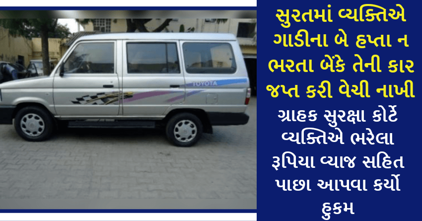 સુરતની એક વ્યક્તિ લોન પર લીધેલી કારના બે હપ્તા ન ભરી શકતા બેંકે તેની કાર કબજે કરી લીધી હતી. જેની સામે એ વ્યક્તિએ ગ્રાહક તકરાર નિવારણ ફોરમમાં ફરિયાદ કરી હતી. જેના પર ગ્રાહક સુરક્ષા કોર્ટે બેંકની કાર્યવાહીને ગેરકાયદે ગણાવી ગ્રાહકે ભરેલા ડાઉન પેમેન્ટ અને હપ્તાની કુલ રૂ. 2.01 લાખની રકમ વાર્ષિક 7 ટકાના વ્યાજ સહિત ચૂકવી આપવા બેંકને હુકમ કર્યો છે.