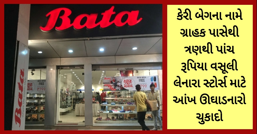 ગ્રાહક કોર્ટે બાટા ઇન્ડિયા લિમિટેડને પેપર બેગના રૂપિયા લેવાને કારણે 9000 રૂપિયાનો દંડ ફટાકાર્યો છે. ચંડીગઢમાં બાટા કંપનીમાં ખરીદી કરવા ગયેલા એક ગ્રાહક પાસેથી પેપર બેગના 3 રૂપિયા લીધા હતા એટલે ગ્રાહકે બાટા કંપની વિરુદ્ધ ગ્રાહકસેવા મંડળમાં ફરિયાદ નોંધાવી હતી. જે મામલે કોર્ટે બાટાને દંડ ફટકારી ફ્રી બેગ આપવાનો આદેશ કર્યો છે.