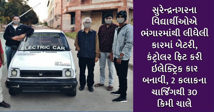 સુરેન્દ્રનગર સી.યુ.શાહ યુનિવર્સિટીમાં ઇલેક્ટ્રિકલ એન્જિનિયરિંગના છેલ્લા વર્ષમાં અભ્યાસ કરતા આકાશ જાદવ, નવદીપ ડોડિયા, ધાર્મિક પાટડિયા, કૃણાલ રાવલે ગાઇડ ભાવેશ રાવલના માર્ગદર્શન હેઠળ ભંગારમાં જતી કારનું ઇલેક્ટ્રિક કારમાં નિર્માણ કર્યું છે. વિદ્યાર્થીઓે અભ્યાસમાં આવતા પ્રોજેક્ટ અંતર્ગત આ કારનું નિર્માણ કર્યું હતું. જેમાં ભંગારમાંથી એક જુની કાર ખરીદી હતી અને તેમાં બેટરી, કન્ટ્રોલર સહિતની વસ્તુઓ ઉમેરી અંદાજે 6 માસની મહેનત બાદ પેટ્રોલ કે ડિઝલના બદલે ઇલેક્ટ્રિકથી ચાલતી કારનું નિર્માણ કર્યું હતું.